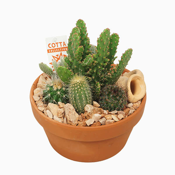 Композиция из нескольких видов суккулентов в керамическом горшке с декором. Варианты в ассортименте, уточняйте у консультантов.
