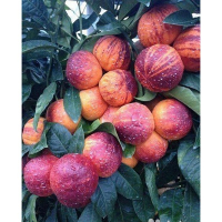 Листья среднего размера, яйцевидные, зеленого цвета с очень интенсивной волнистостью листье вверху кроны. Плодоношение ранне и обильное. Плоды среднего размера, сферической формы с верхушкой слегка впалой и хорошо прилегающей к черешку. На кожуре аркоболена присутствуют продольные полосы интенсивного красного цвета, окрашенные антоцианином, которые чередуются с желтыми полосками, образующими высокоэстетичный внешний вид. Кожура богата эфирными маслами с приятным запахом. Мякоть слегка кислая.