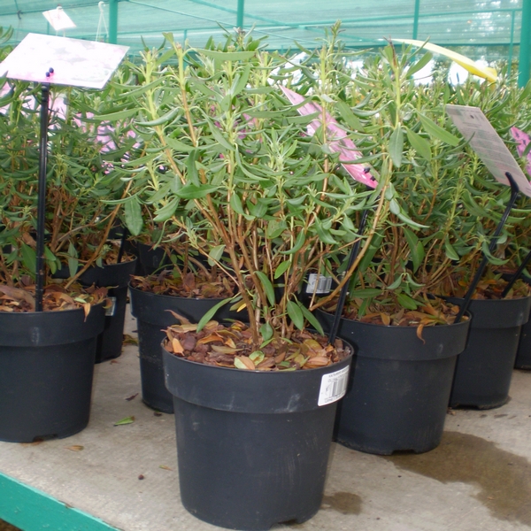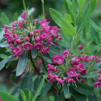 Кальмии — вечнозелёные кустарники высотой около 0,5 - 1 м, с широкораскидистой кроной, обильно цветущие в мае. Весьма декоративны во время цветения. Цветы темно-пурпурные, до 1 см в диаметре, собраны в многоцветковые густые боковые соцветия. Время цветения: июнь-июль. Листья вечнозеленые, ланцетные, до 6 см длины.