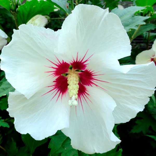 Общая характеристика: Конусовидный кустарник средней величины, 1.5-2 (3)м высотой, 1-1.5 (2)м шириной, ветви направлены вверх, медленнорастущий. Цветы - живописные, крупные, подобны мальвам, цветет обильно и продолжительно. Срок цветения зависит от сорта - начиная с конца июня до сентября. Плоды - неприметные, коричневатые капсулы - семенные коробочки. Листья - яйцевидные и трехлопастные, зеленые, позднее распускание, в осенний период бледно - зеленая окраска. Корневая система стержневая.