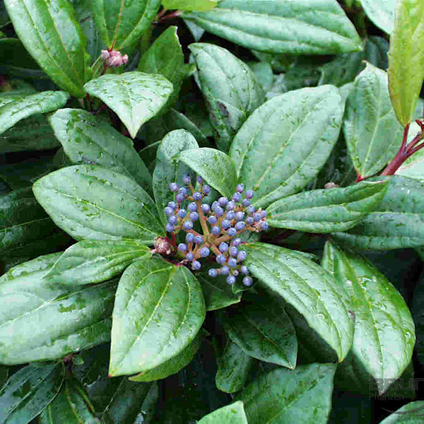 Карликовый вечнозеленый кустарник высотой около 1 м, с горизонтально растущими, симметрично расположенными побегами. Крона компактная. Растет медленно. В культуре высота его 0,5-0,8 м. Диаметр кроны в два раза больше. Очень декоративны листья кожистые, вечнозеленые, супротивные, эллиптические, длиной 7-15 см, шириной до 8 см, темно-зеленые. Характерны глубокие параллельные жилки. Цветки бело-розовые, собраны в зонтиковидные соцветия диамет-ром до 8 см. Цветет в июне. Плоды 6 мм длиной необычной голубой окраски, созревают в октябре.