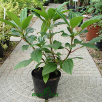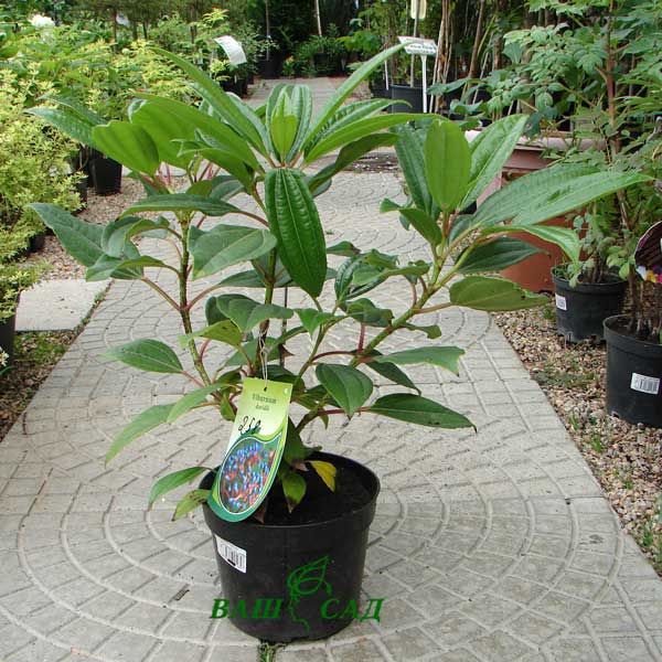Калина Давида - карликовый вечнозеленый кустарник, достигающий высоты до 1 м, с горизонтально растущими, симметрично расположенными побегами. Крона компактная. Растет медленно. Листья очень декоративны, кожистые, вечнозеленые, супротивные, эллиптические, длиной 7-15 см, шириной до 8 см, темно-зеленые. Характерны глубокие параллельные жилки. Цветки бело-розовые, собраны в зонтиковидные соцветия диаметром до 8 см. Цветет в июне. Плоды 6 мм длиной необычной голубой окраски, созревают в октябре.