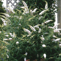 Буддлея Давида Вайт Профьюжн (Buddleja davidii White Profusion) - лиственный красивоцветущий кустарник, плотной округлой формы, высотой и шириной до 2м, с сильными вертикальными, широко распростёртыми, поникающими на концах ветвями. Цветёт белыми конусовидными соцветиями, с приятным ароматом, привлекающим насекомых-опылителей и бабочек. Быстрорастущий.