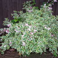 Вейгела цветущая Нана Вариегата (Weigela florida Nana Variegata) - компактный, густой кустарник с округлой формой. Достигет высоты 1,5 м. и около 2 м. в диаметре.