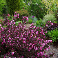 Вейгела цветущая Фолис Пурпуреус, (Weigela florida Foliis Purpureis) - кустарник от 1 до 1,5 м высотой с густой кроной диаметром около 2 м. Листья эллиптические, коричнево-красные, красно-зеленые, длиной 6 - 8 см, осенью долго остаются на ветвях .Цветки длиной 2,5 - 3 см, темно-розовые с желтой серединкой, собраны в соцветия по 3 - 4 штуки, контрастируют с листьями.