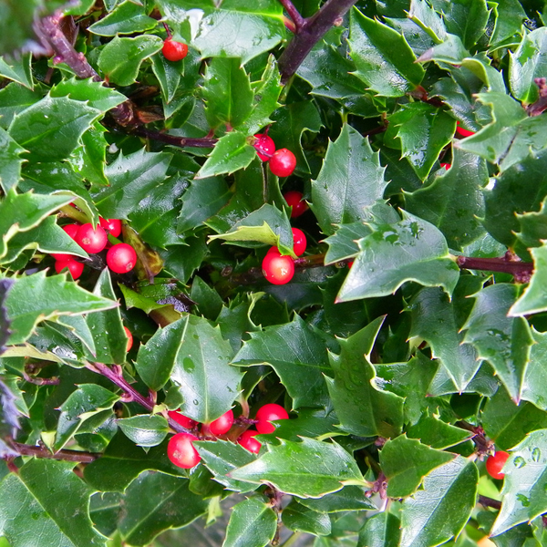 Листья: вечнозеленые, овальные или узкояйцевидные, блестящие, темно-зеленые, зимой с черным оттенком, мягкие, кожистые, края молодых листьев с колючками.