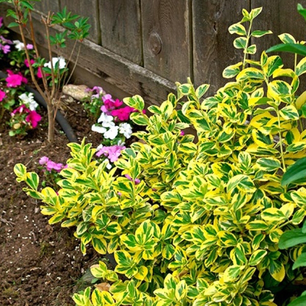 Бересклет Форчуна "Эмеральд Голд" - чрезвычайно распространенный сорт. Это компактный медленно разрастающийся кустик в высоту до 30 см. Листья небольшие – 2 см, остролистные. Высоко ценится за окраску: сами листья яркие изумрудные, а их окантовка золотистая, желтая. Осенью растение меняет окраску, становится красновато-бурым.