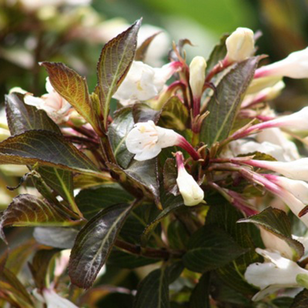 Вейгела цветущая Блек энд Уайт (Weigela florida Black and White) - карликовый медленнорастущий кустарник с округлой кроной 30-40 см высотой, ширина 60-80 см. Цветки чисто белые с карминно-красным горлом, колокольчиковидные, многочисленные, появляются на концах побегов в июне, красиво контрастируют с темным оттенком листвы. Листья изначально темно-зеленые, постепенно становятся темно сливово-пурпурными.