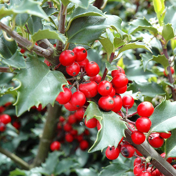 Листья: вечнозеленые, овальные или узкояйцевидные, блестящие, темно-зеленые, зимой с черным оттенком, мягкие, кожистые, края молодых листьев с колючками.