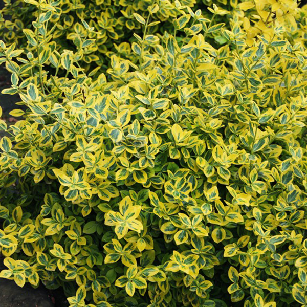 Бересклет Форчуна Эмеральд Голд - чрезвычайно распространенный сорт. Это компактный медленно разрастающийся кустик в высоту до 30 см. Листья небольшие – 2 см, остролистные. Высоко ценится за окраску: сами листья яркие изумрудные, а их окантовка золотистая, желтая. Осенью растение меняет окраску, становится красновато-бурым.