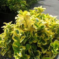 Бересклет японский Aureomarginatus (Ауреомаргината) - кустарник с плотной широко-раскидистой кроной. Листья овальной формы, вечнозеленые, по краям бело-желтая кайма, меет ярко-зеленую и зелено-желтую сочные расцветки листьев. Форма этого бересклета в виде кустарника или дерева, высотой в культуре не более 1,5 м.