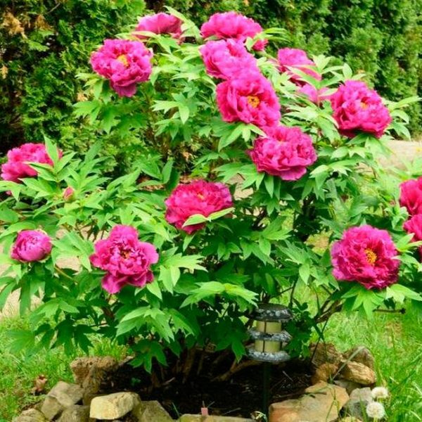 Пион древовидный – листопадный кустарник с маловетвистым древеснеющим прямостоячим стеблем, достигающий в высоту 2 м, у основания до 2-3 см в диаметре, с темно-бурой корой. Листья ярко-зеленые, дважды непарноперистые. Листва и сам куст очень декоративны, но особенно роскошны цветки – огромные чаши или шары диаметром до 25 см, ароматные, полумахровые или махровые, сидячие на прямых, толстых цветоножках. Тычинки многочисленные, золотисто-желтые. Плод – многолистовка. Семена прикрепляются к краю брюшного шва листовки, крупные, шаровидные, темно-коричневые, почти черные.