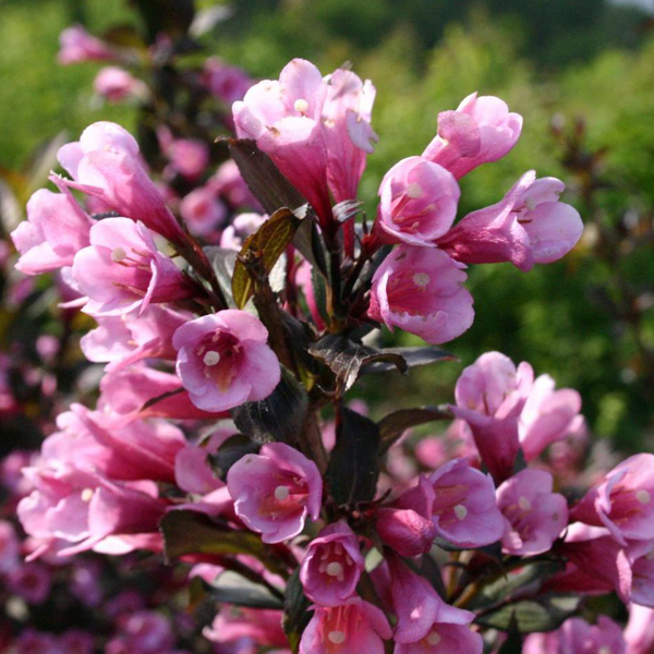 Вейгела цветущая Нана Пурпуреа (Weigela florida Nana Purpurea) -лиственный, красивоцветущий, компактный, медленнорастущий, кустарник с густой, раскидистой шаровидной формы кроной. Высота растения достигает 1 м. Имеет необычный коричнево-красный окрас листвы - при выращивании на солнце листья почти коричневые, очень декоративные. Во время цветения куст густо усыпан темно-розовыми “колокольчиками”.