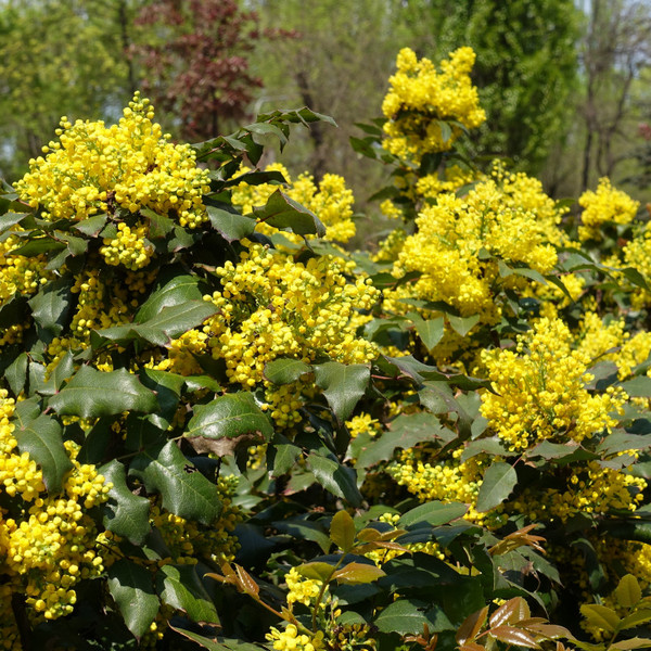 У магонии ароматные золотисто-желтые цветки, которые собраны в кисти 5-7 см длиной. Они появляются весной и привлекательны для опылителей, таких как пчелы и бабочки. Летом на месте цветков появляются темные иссиня-черные ягоды размером с изюм. Эти ягодки нравятся целому ряду птиц, которые также могут укрыться в густой зеленой листве. Ягоды в свежем виде съедобны для человека, хотя несколько кисловаты, из них получаются отличные желе с добавлением сахара.