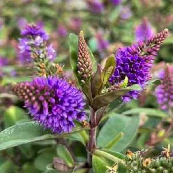 Хебе привлекает внимание своими крупными и похожими на ершики соцветиями и кожистыми блестящими листьями. Цветки обычно фиолетовые или темно-красные.