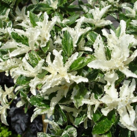 Листья: пёстрые, овальной формы, зубчатые по краям, супротивно расположенные, эллиптические, или округло-яйцевидные, длиной 4 см и шириной 2,8 см, темно-зеленые с яркими бело-кремовыми вкраплениями. Новый рост листьев чисто белый, потом с розовым оттенком зимой.