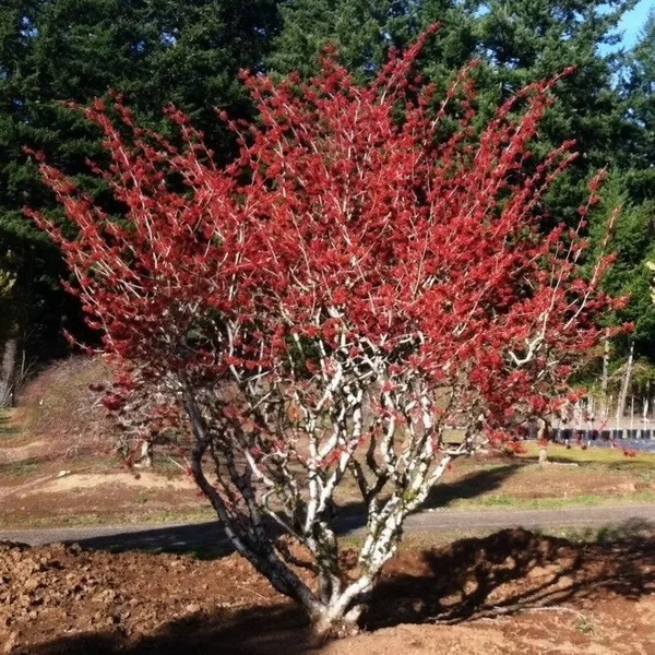 Гамамелис гибридный Diane (ведьмин орех Диана) красивейший сорт с красными цветами.За десять лет этот сорт ведьминого ореха вырастает примерно на два метра в высоту, максимальная высота дерева достигает трех метров - небольшое листопадное деревце или кустарник с бурыми, звездчато-опушенными побегами. Самый лучший и популярный сорт с винно-красными цветами появился в результате скрещивания гамамелиса японского и мягкого. Темно-зелеными кожистыми листьями и ярко-желтыми или красными, четырехмерными, обоеполыми цветками. Четыре узких лентовидных лепестка, распростерты в разные стороны, так что в диаметре цветок достигает нескольких сантиметров.