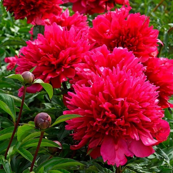 Пион Many Happy Returns (Мени Хеппи Ретернс) - современный карминно-красный, сорт. Цветки пышные, в роспуске почти круглые, махровые. По мере роспуска лепестки приобретают желтоватый оттенок (см. фото). Листва сильно рассеченная, плотная, полуматовая. Цветоносы нуждаются в подвязке, чтобы крупные цветки не поникали. Сорт Мери Хеппи Ретернис в 2007 году награжден золотой медалью самого престижного в мире общества American Peony Society.