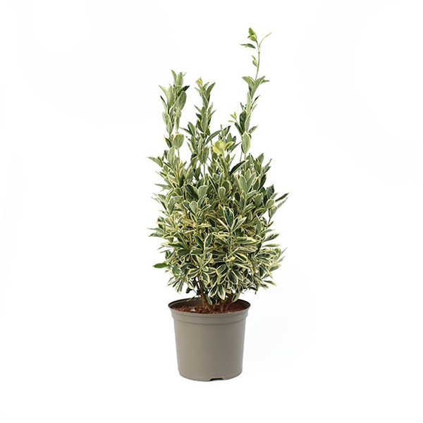 Euonymus japonicus Bravo - вечнозеленый декоративный кустарник с темно-зелеными глянцевыми листьями, которые имеют ярко-белую или кремовую кайму, создавая пестро-белый эффект.
