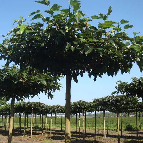 Листва: Имеет пышную, густую лиственность. Отдельные листки крупные по 20 - 25 см в длину. Каждый из них имеет по три неправильные доли. Окрас меняется от изумрудно - зеленых сверху, до темно - зеленых снизу. Осенью листва быстро осыпается.