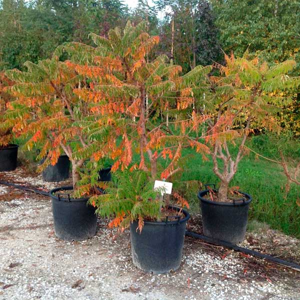 Rhus typhina Dissecta - деревце небольших размеров с опушенными горизонтальными побегами, достигающее в высоту 10–12м, издали похожее на пальму с несколькими стволами.