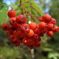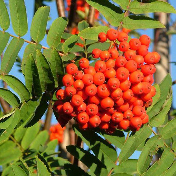 Рябина - вид древесных листопадных растений из рода Рябина семейства Розовые. Представляет собой средневысокое дерево, реже кустарник с ажурной округлой кроной. В высоту достигает 5-10 (12) м, в ширину 4-6 м. Кора желто-серая или светло-серо-коричневая, гладкая, блестящая. Молодые побеги серо-красного цвета, опушенные. Почки войлочно-пушистые. Листья очередные, достигают 20 см в длину, непарноперистосложные, состоят из 7-15 листочков, ланцетной или вытянутой формы, заостренные или зубчатые по краю, цельнокрайние в нижней части и пильчатые в верхней. Сверху листики зеленые, матовые, снизу – более бледные, опушенные. Осенью листья меняют свой цвет на золотистый и красный.