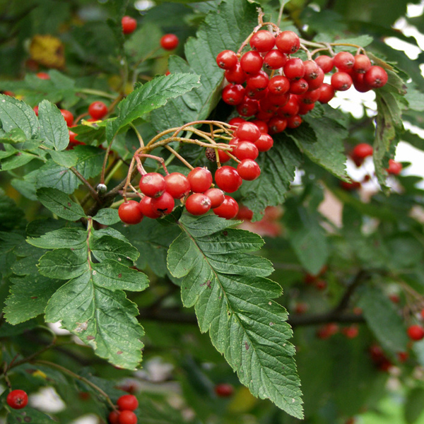 Рябина - вид древесных листопадных растений из рода Рябина семейства Розовые. Представляет собой средневысокое дерево, реже кустарник с ажурной округлой кроной. В высоту достигает 5-10 (12) м, в ширину 4-6 м. Кора желто-серая или светло-серо-коричневая, гладкая, блестящая. Молодые побеги серо-красного цвета, опушенные. Почки войлочно-пушистые. Листья очередные, достигают 20 см в длину, непарноперистосложные, состоят из 7-15 листочков, ланцетной или вытянутой формы, заостренные или зубчатые по краю, цельнокрайние в нижней части и пильчатые в верхней. Сверху листики зеленые, матовые, снизу – более бледные, опушенные. Осенью листья меняют свой цвет на золотистый и красный.
