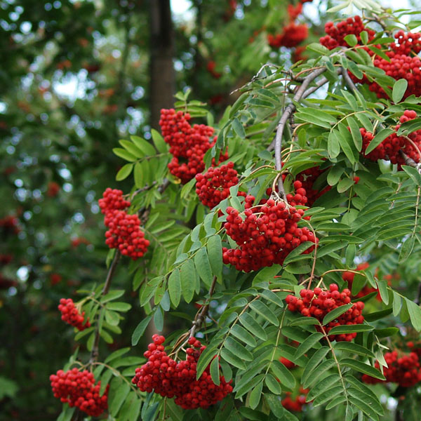 Рябина - вид древесных листопадных растений из рода Рябина семейства Розовые. Представляет собой средневысокое дерево, реже кустарник с ажурной округлой кроной. В высоту достигает 5-10 (12) м, в ширину 4-6 м. Кора желто-серая или светло-серо-коричневая, гладкая, блестящая. Молодые побеги серо-красного цвета, опушенные. Почки войлочно-пушистые. Листья очередные, достигают 20 см в длину, непарноперистосложные, состоят из 7-15 листочков, ланцетной или вытянутой формы, заостренные или зубчатые по краю, цельнокрайние в нижней части и пильчатые в верхней. Сверху листики зеленые, матовые, снизу – более бледные, опушенные. Осенью листья меняют свой цвет на золотистый и красный.