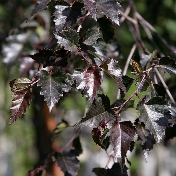 Береза Пурпуреа пендула - отличается необычным цветом листвы и ажурной конической кроной. Узкое, медленнорастущее дерево с бородавчатыми веточками и темно-серо-черной корой. Особенно эффектны у нее ромбовидные, необыкновенной яркой окраски листья. Рано весной, распускающиеся листочки имеют очень яркий и выделяющийся на фоне нежно- зеленой листвы других деревьев темно-красный цвет, летом они становятся темно-пурпурными, а осенью перекрашиваются в коричнево-красный. Поэтому эта березка очень эффектно смотрится на фоне зданий или растений с контрастной окраской, как в одиночных посадках, так в составе сложных древесно-кустарниковых композиций.