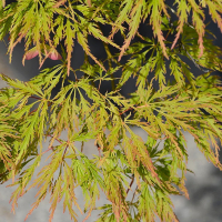 Листва: Особенным достоинством этого вида являются его необыкновенные листья. Каждый листок имеет до 7 лопастей, рассечены до основания с узорами, края зазубренные. В период распускания имеют сочный зеленый цвет, осенью приобретают насыщенный желтый оттенок.