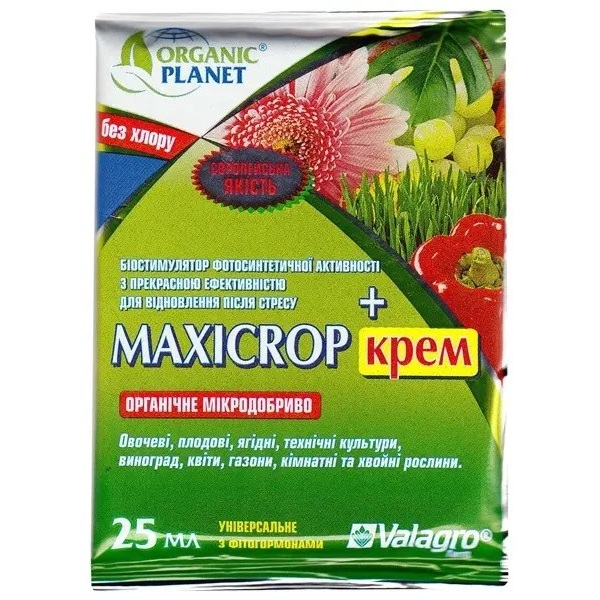 Максикроп Крем концентрированный стимулятор, содержащий гормоны и микроэлементы. Предназначен для активации фотосинтеза, улучшения роста и повышения урожайности растений благодаря усилению их иммунитета. Используется как дополнительная подкормка плодово-ягодных и технических культур, винограда, цветов и газонов. Препарат Максикроп Крем особенно эффективен при неблагоприятных погодных условиях (замораживание, засуха, шквалы ветра и т.п.), когда выработка растительных гормонов может сильно снизиться.