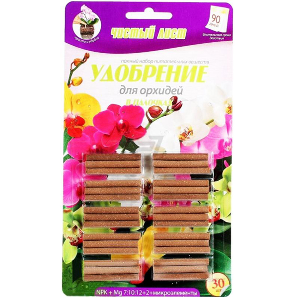Удобрение для орхидей Чистый лист в палочках - удобрение длительного действия дающее наилучший результат. Три месяца без забот о подкормке цветов благодаря длительному обеспечению растения питательными веществами.