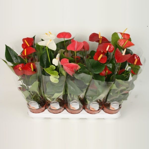 Антуриум Микс - цветок фламинго, который был известен еще в Древней Греции. Восковое растение отлично дополнит комнатную оранжерею или зимний сад своими необычными цветами. Это травянистый, вечнозеленый цветок, обладающий приятной глянцевой поверхностью листьев и уникальными "лакированными" цветами. Одной из особенностей антуриума является то, что он поворачивает свои листья вслед за солнечными лучами.