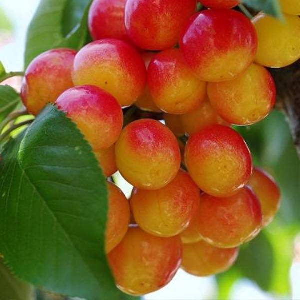 Черешня Розовый Гигант - это высокорослое дерево с крупными сладкими ягодами желтого цвета, покрытыми розовым румянцем, который простирается практически по всей поверхности плода.