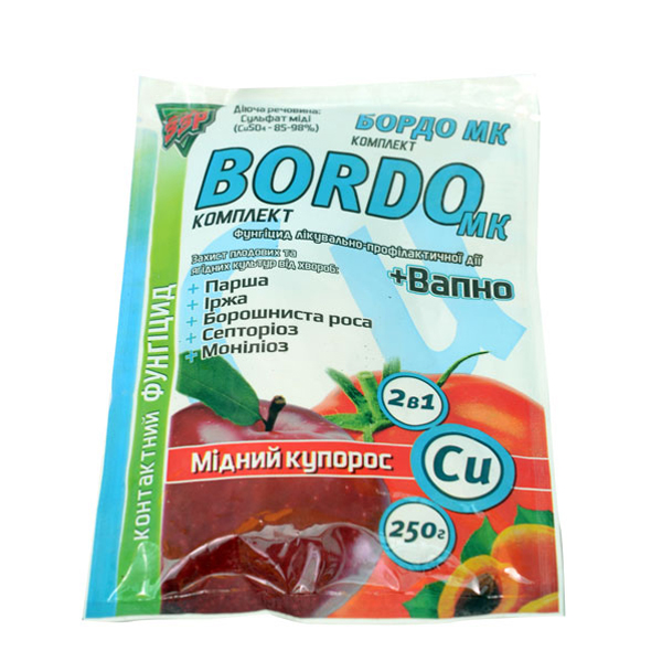 Бордо МК Комплект - фунгицид для обработки плодовых, ягодных и овощных культур от возбудителей грибковых и бактериальных болезней. Бордо МК Комплект состоит из сульфата меди высокого качества и активной негашеной извести в пропорции: медный купорос 50 г и известь - 75 г. Опрыскивание проводят утром или вечером с помощью обычного опрыскивателя при температуре не более +25 ° С. Препарат не рекомендуется применять меньше чем за 4 часа до выпадения осадков. Опрыскивание плодово-ягодных деревьев и кустарников проводится весной, до распускания почек или осенью, после опадания листьев, овощные культуры опрыскивают во время бутонизации в период вегетации. Интервал между опрыскиваниями должен составлять не менее 2-х недель. Большего эффекта от применения препарата можно достичь при обработки растений до их инфицирования возбудителями болезней. Рабочий раствор: для приготовления 10 л 1-но % рабочего раствора необходимо 150 г извести и 100 г медного купороса, для приготовления 10 л 3-х % рабочего раствора необходимо 450