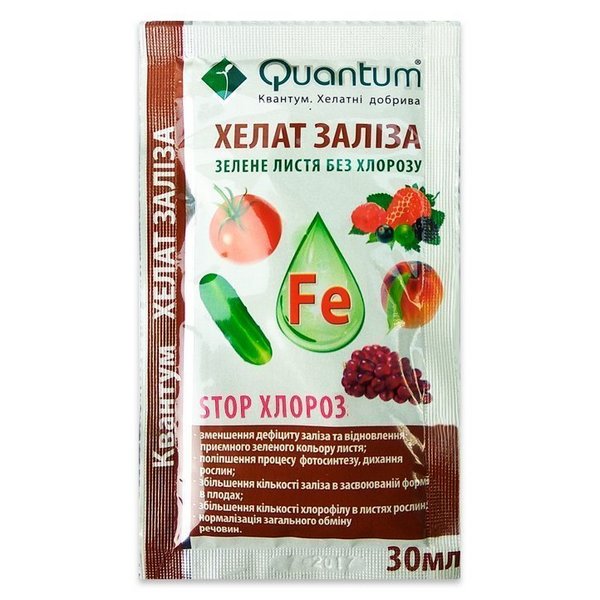 Лечение хлороза растений: растворить содержимое пакета 30 мл в 5 л воды для фруктовых деревьев или в 7 л воды для других культур. Опрыскивать этим раствором листья растений, не допуская стекания. Обработать 4 раза с интервалом 2 недели. Для ускорения эффекта через неделю после каждой обработки «Квантумом Хелат Железа» растения рекомендуется обработать микроудобрениями: «Квантум – Овощные», «Квантум – Декоративные», «Квантум – Плодово-Ягодные», в рекомендованных дозах.
