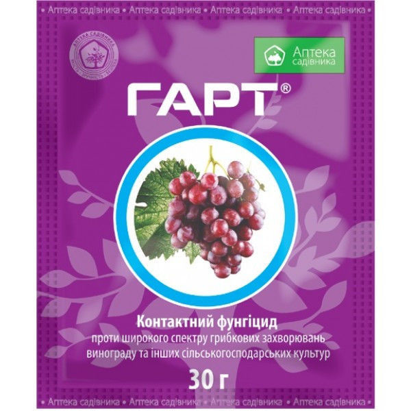 Гарт - высокоэффективный фунгтцид от многих возбудителей грибковых заболеваний сельскохозяйственных культур, таких как фитофтороз, бактериальная пятнистость, переноспороз, макроспороз, парша. Имеет небольшую дозу в применении. Укрепляют растение перед весенними заморозками. Безопасен для среды обитания.