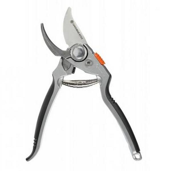 Секатор Gardena BP 50 Premium изготавливается из высококачественных материалов, надежный и долговечный. Верхнее лезвие изготовлено из нержавеющей стали и имеет прецизионную заточку, оно съемное и может быть заменено на новое, нижнее лезвие кованое, его можно подтачивать. Профильные рукоятки с двумя положениями захвата позволяют производить как мощную обрезку, так и быстрое срезание. Эргономичные, особо прочные алюминиевые рукоятки удобно лежат в руке. Фиксатор, переключаемый одной рукой, дает возможность с легкостью заблокировать секатор для безопасного хранения. На рукоятке присутствует резиновый упорный амортизатор, который способствует гашению удара при срезе. Секатор имеет регулируемое натяжение лезвий и расположенную под углом режущую головку. Максимальный диаметр подрезки — 22 мм.