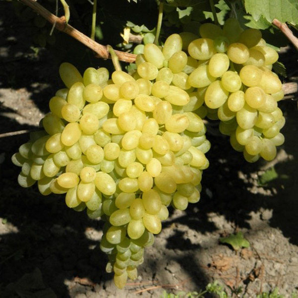 Относится раннеспелым сортам, срок вызревания ягод 120 дней. Ягоды не содержат семян. Грозди крупных размеров, конической формы и средней плотности. Вес каждой кисти от 700 до 2000 грамм. Форма ягод овально-продолговатая, цвет при вызревании золотисто-желтый, средних размеров (6-10 г.). Мякоть плотная и хрустящая с приятным мускатным вкусом.