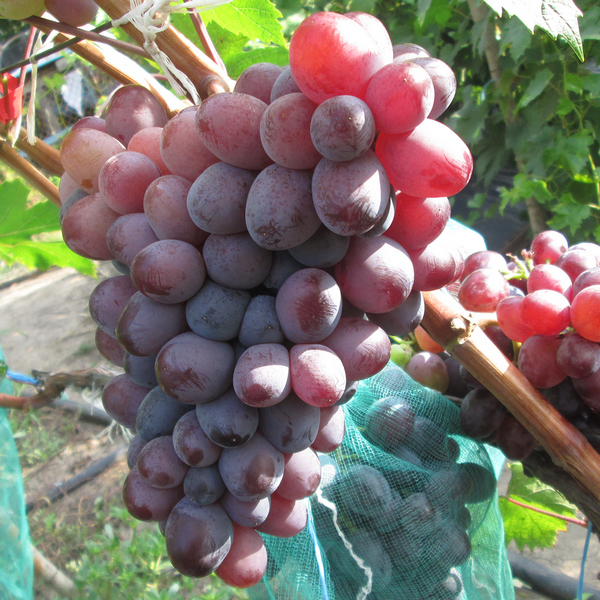 Виноград кишмиш Сказка — бессемянная форма винограда среднеспелого срока созревания. От распускания почек в глазках до созревания ягод проходит 125-130 дней. В условиях юга Украины созревает в конце августа. Гибридная форма селекции Калугина В. М. Получена при скрещивании Талисман х кишмиш Осенний королевский. Кусты у этого винограда очень сильнорослые, цветок обоеполый. Вызревание лозы хорошее. Грозди крупные, конической или цилиндрической формы, средней плотности, выростают весом в 700-1000 грамм и более. Ягоды яйцевидной формы, похожи на сорт Талисман по форме, в стадии полной зрелости окрашенные в темно-розовый цвет с фиолетовым отливом, очень крупные (как для кишмиша), отдельная виноградина достигает в весе 7-12 грамм. Вес ягоды напрямую зависит от агротехники. Это один из самых крупноягодных кишмишей в мире на сегодняшний день, причем, ягоды долго висят на кусте, не теряя качеств, а при соблюдении условий, этот виноград может спокойно долежать до февраля. Кожица ягод средней толщины, растрескиваний не наблюдалось. Мякоть мясистая, сочная, гармоничного вкуса. Класс бессемяности – II-III. В ягодах, в верхей части грона, иногда попадаются рудименты, но при еде не ощущаются. Ягоды тяжелые на отрыв, и это очень важное достоинство при транспортировке и продаже на рынке. Другие параметры находятся на стадии изучения. Автор все свои сеянцы не укрывает на зиму , минимально температура, на его участке, опускалась до -25°С. Кишмиш Сказка такие морозы выдержал и полностью отплодоносил. На севере Украины рекомендуется выращивать в укрывной форме, пока сорт не проверят в неукрывной формировке. Правда, можете рискнуть и посадить у себя как неукрывной, но вероятность вымерзания, при более низких температурах очень и очень велика. Только один из родителей предрасположен к неукрывной формировке. Устойчивость к милдью, серой гнили и оидиуму отмечается очень высокая.