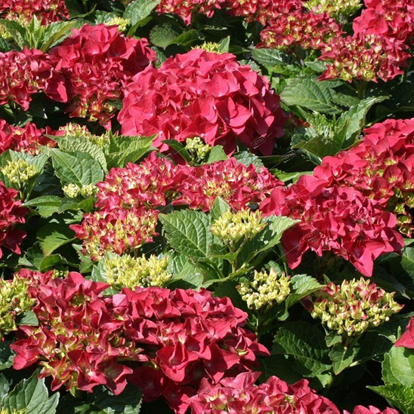 Hydrangea macrophylla Hot Red - не высокий, пышный, лиственный кустарник шаровидной формы с красными цветами, собранными в роскошные шапки до 15 см в диаметре, на фоне темно-зеленых листьев.