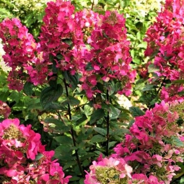 Новинка 2020г. Компактный кустарник. Соцветия при этом очень крупные, высокие, узкопирамидальные, в начале белые, затем быстро меняют расцветку на розовую, и в конце цветения становятся малиновыми. Цветет обильно на побегах текущего года, с конца июня - начале июля по ноябрь. В соцветии стерильных цветков больше, чем фертильных, соцветие плотное. Побеги темно-коричневые, очень крепкие, хорошо выдерживают достаточно большую массу соцветия. Не требуют опоры. Высота взрослого куста до 1 м и около 1 м в ширину.