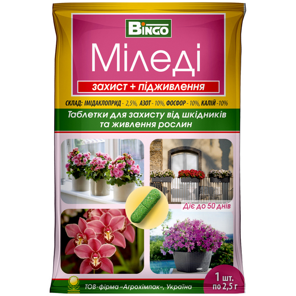 Миледи представляет собой контактно-системный инсектицид в таблетках, который также служит минеральной подкормкой для комнатных декоративных растений в закрытых почвах, предоставляя им защиту от листогрызущих и сосучих насекомых вредителей. Главный активный компонент данного средства – имидаклоприд, который, при контакте с насекомыми, нарушает работу центральной нервной системы, вызывая паралич и последующую гибель. Помимо защитного действия таблетка содержит удобрение с питательными компонентами азота (N), фосфора (P) и калия (K) в равных пропорциях. Данное удобрение укрепляет иммунитет растений и обеспечивает их необходимыми питательными веществами для их здорового роста и развития. С таким питательным комплексом растение лучше переносит действие химических веществ без риска фитотоксического эффекта. Универсальная таблетка Миледи включает в себя качества инсектицидного препарата и удобрения, обеспечивая надлежащую комплексную минеральную подкормку комнатных растений, а также их защиту от белокрылки, щитовки, червеца, клопа, цикадки, трипса, тли, моли, блешки, скосара, паутинного клеща. и других вредителей.