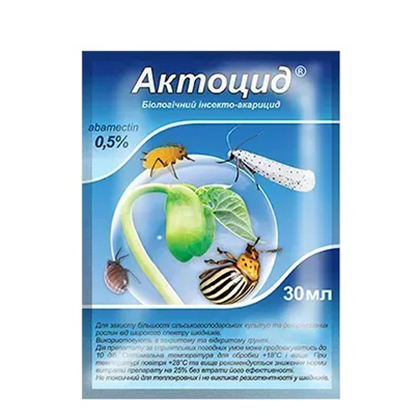 Актоцид – биологический инсекто-акарицид с контактно-кишечным эффектом и используется для защиты сельскохозяйственных и декоративных растений от многочисленных видов вредных насекомых. Это средство оказывает максимальное влияние на насекомых независимо от этапов их развития. При правильном использовании, вы сможете добиться желаемого результата уже после первого применения и в кратчайшие сроки. Инсектицид Актоцид имеет длительный период защитного действия сроком до 10 дней и предоставляет эффективную защиту для картофеля, томатов, огурцов, баклажанов, кабачков, перца, дыни, арбуза, крыжовника, смородины, клубники, малины, ежевики, винограда, персика, абрикоса, груши, яблони, сливы, черешни, вишни и других сельскохозяйственных культур, а также для декоративных садовых и комнатных растений от колорадского жука, комплекса сосущих вредителей, клещей, тлей, яблоневой моли, пыльщиков, цветоедов, трипсов, минующих молей и других насекомых-вредителей.