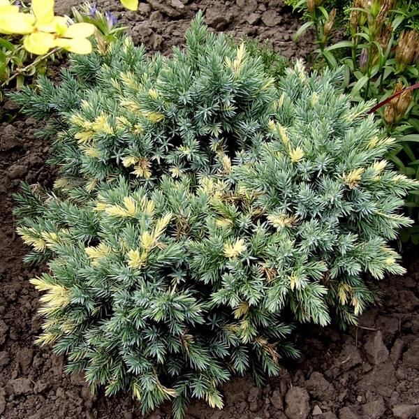 Можжевельник Floreant - карликовый хвойный кустарник шаровидной формы с бело-кремовыми пятнами, нерегулярно разбросанными по серебристо-голубой хвое.
