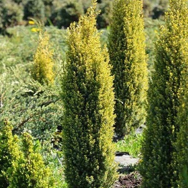 Плотный кустарник со стройной узкоколоновидной формой кроны. Хвоя игольчатая, колючая, желто-зеленая, к зиме желто-коричневая. Морозостоек.