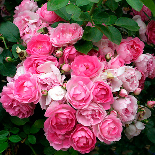Плетистый сорт, однократно цветущий Hybrid Wichurana. Насыщенно-розовые, полумахровые (9-16 лепестков) цветки с золотисто-желтыми тычинками, плоской, открытой формы, в крупных соцветиях.