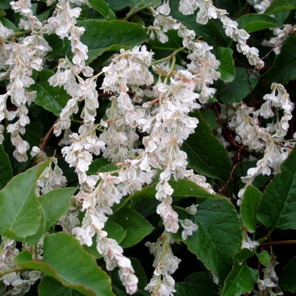 Листья и цветы: листья темно-зеленые, цветы мелкие и белые в длинных соцветиях-гроздьях. Цветет в конце лета и до самых заморозков. Молодые побеги красноватого цвета, с возрастом одревесневают становятся коричневыми.