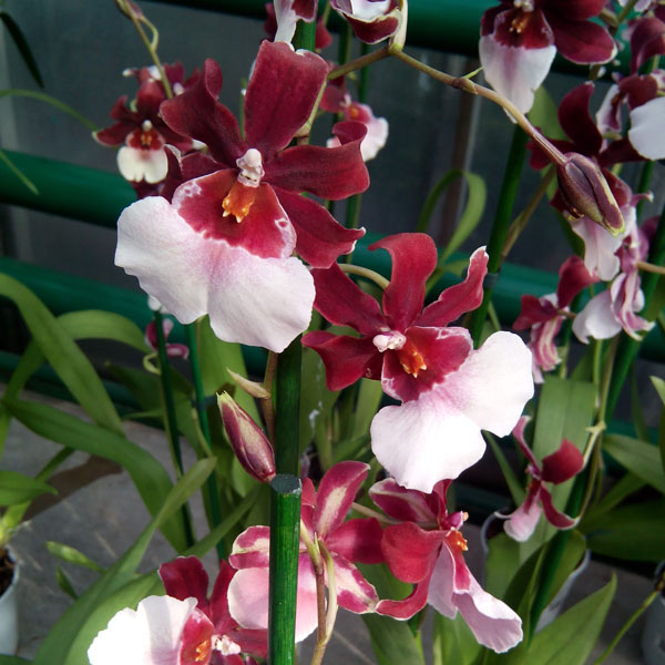 Камбрия - элегантное растение с красными и желтыми цветками, окаймленными белыми и розовыми полями. Длинный, растущий вертикально цветонос, как правило, содержит от 5 до 20 цветков, цветущих от 4 до 8 недель. Взрослое растение может иметь большее количество цветков.