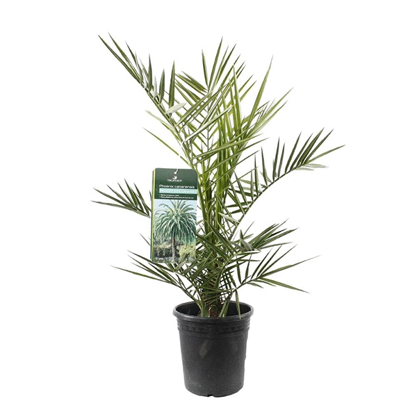 Финик канарский вырастает до 2 м в высоту. Перистые ваи (до 3-5 м) сизо-зеленого цвета разделены на листочки по обе стороны средней жилки. Листочки жесткие, прямые и узкие. Черешки покрыты игловидными шипами. Ваи слегка отогнуты наружу.
